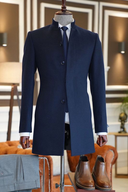 | product name: | Marvin Navy Blue Stand Collar Slim Fit Tailored Wool Jacket For Business |